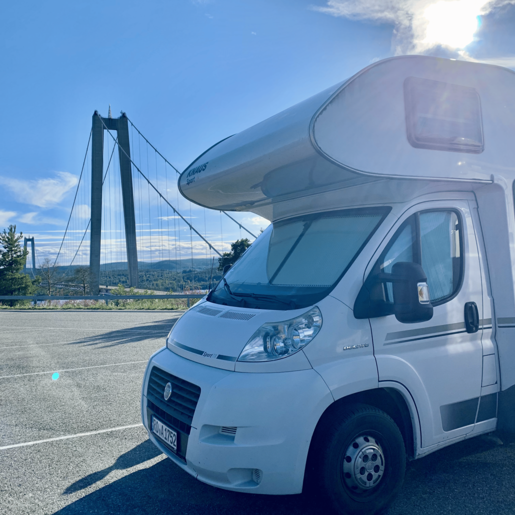 Eine wunderschön angelegte Raststation mit Aussicht über die Brücke, ein riesiger Kinderspielplatz, Picknickbänke und ein Stellplatz mit Aussicht über die beleuchtete Brücke. Der große Vorteil an einer Reise ohne Ziel und Zeitdruck ist, dass Flexibilität und so entschieden wir uns kurzerhand hier zu übernachten.